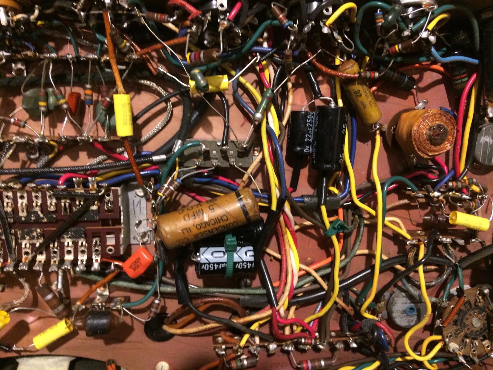 Getting it out of the case is a chore. Having plunked down the $25 for the dead machine, I got a service manual on Ebay for $29. I had some rubber grommets on hand. The tubes all tested great to good. Once the motors were quiet, it obviously needed filter caps. I ordered a mostly complete set of caps, all the paper and electrolytics, except for the inevitable two I forgot, and while I was at it, did the same for the barn radio, for a total order from Just Radios of $30. The photos above are post. I have it back together now, and have been enjoying it, but the 6E5 recording level indicator needs a new diode to close, and well, there’s those two caps I forgot…